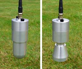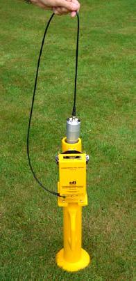 The Tester consists of a pair of 0.5 Kg sensor probes. The two probes are shown on the right. The left-hand one is the domed probe whose diameter is the same as a golf ball. The right-hand probe has a flat face of diameter 50mm. Both probes are provided with the equipment allowing for different testing regimes. The chosen probe is placed in the guide tube and supported by the cable. When released it falls through the guide tube and strikes the surface under test, decelerating at a rate determined by the stiffness of the material within the region of impact. The readout registers the hardness values in units of Gravities (Gm). The Gm value is an indication of soil strength.